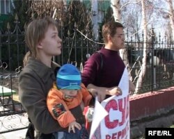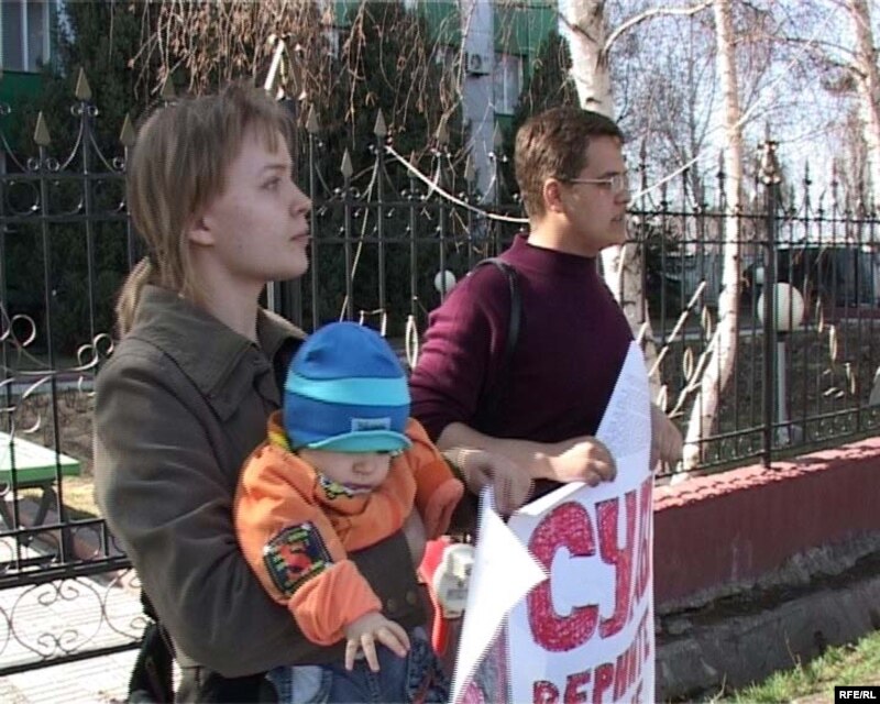 Жители Талдыкоргана Евгения Шепеткова и Андрей Шалимов проводят пикет у здания Алматинского областного суда. 27 марта 2009 года.