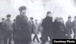 Участники демонстрации держат плакат с надписью «Мы за свободное добровольное слияние и сближение...». Алма-Ата, 17-18 декабря 1986 года. Фотокопия из Центрального государственного архива Алматы.