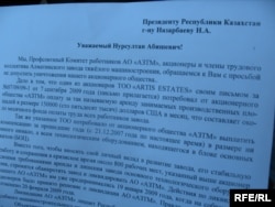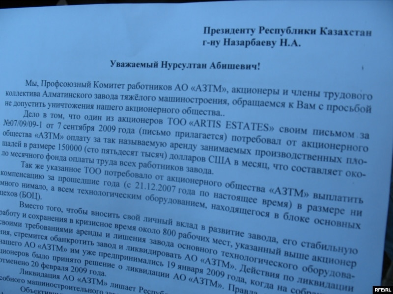 Так выглядит письмо рабочих АЗТМ президенту Казахстана Нурсултану Назарбаеву. Алматы, 21 сентября 2009 года.