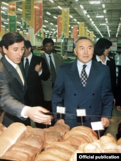 Молодой бизнесмен Болат Абилов представляет хлебобулочную продукцию президенту Нурсултану Назарбаеву. Алматы, 1994 год.