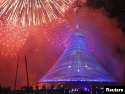 Праздничный салют над вновь открытой достопримечательностью Хан Шатыр. Астана, 6 июля 2010 года.