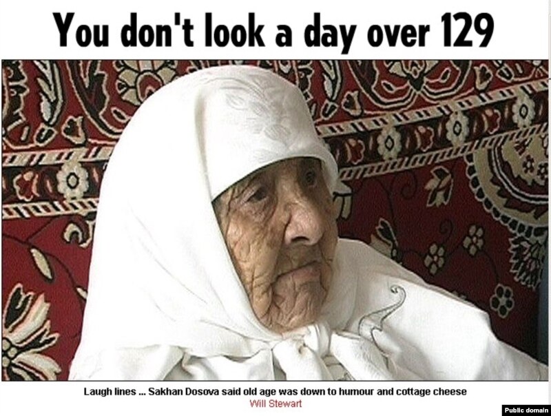 Но умиляет своеобразный юмор британской бульварной газеты the Sun, выразившийся в подзаголовке к фотографии Сахан Досовой. На русский язык эту надпись можно перевести как "Вы выглядите ни дня старше, чем на 129 лет".