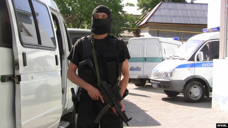 Боец полиции наблюдает за обстановкой на территории суда в день оглашения приговора по делу Султана Махмадова и Рамазана Есергепова. Тараз, 8 августа 2009 года.