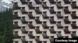 Внизу сохранились очертания холла с винтовой лестницей. Номера в гостинице очень компактные, на вид не больше 10 квадратных метров. Зато у каждого совершенно прекрасный балкончик с видом на домбайские ущелья.