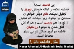 На втором рисунке облаченная в черную одежду девочка держит в руках Коран. «Это Фатима, — говорится в тексте. — Фатима не только не отмечает Наурыз, но и предостерегает от этого других мусульманских сестер. Потому что она знает, что Наурыз придуман и пропагандируется зороастрийскими традициями. Фатима очень осторожна в вопросах религии».