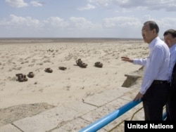 Генеральный секретарь ООН Пан Ги Мун посетил кладбище кораблей. Бывший портовый город Муйнак на Аральском море. 4 апреля 2010 года.