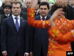 Президент Гурбангулы Бердымухамедов и президент России Дмитрий Медведев на открытии новой русской школы. Ашгабад, 22 декабря 2009 года.