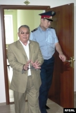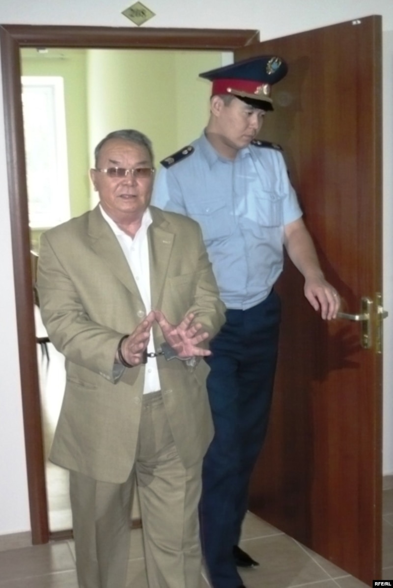 Полицейский выводит писателя Алпамыса Бектурганова из зала суда. Его посадили в тюрьму за публичную критику акима Бактыкожи Измухамбетова. Бектурганов был также исключен из Союза писателей. Уральск, 13 августа 2009 года.