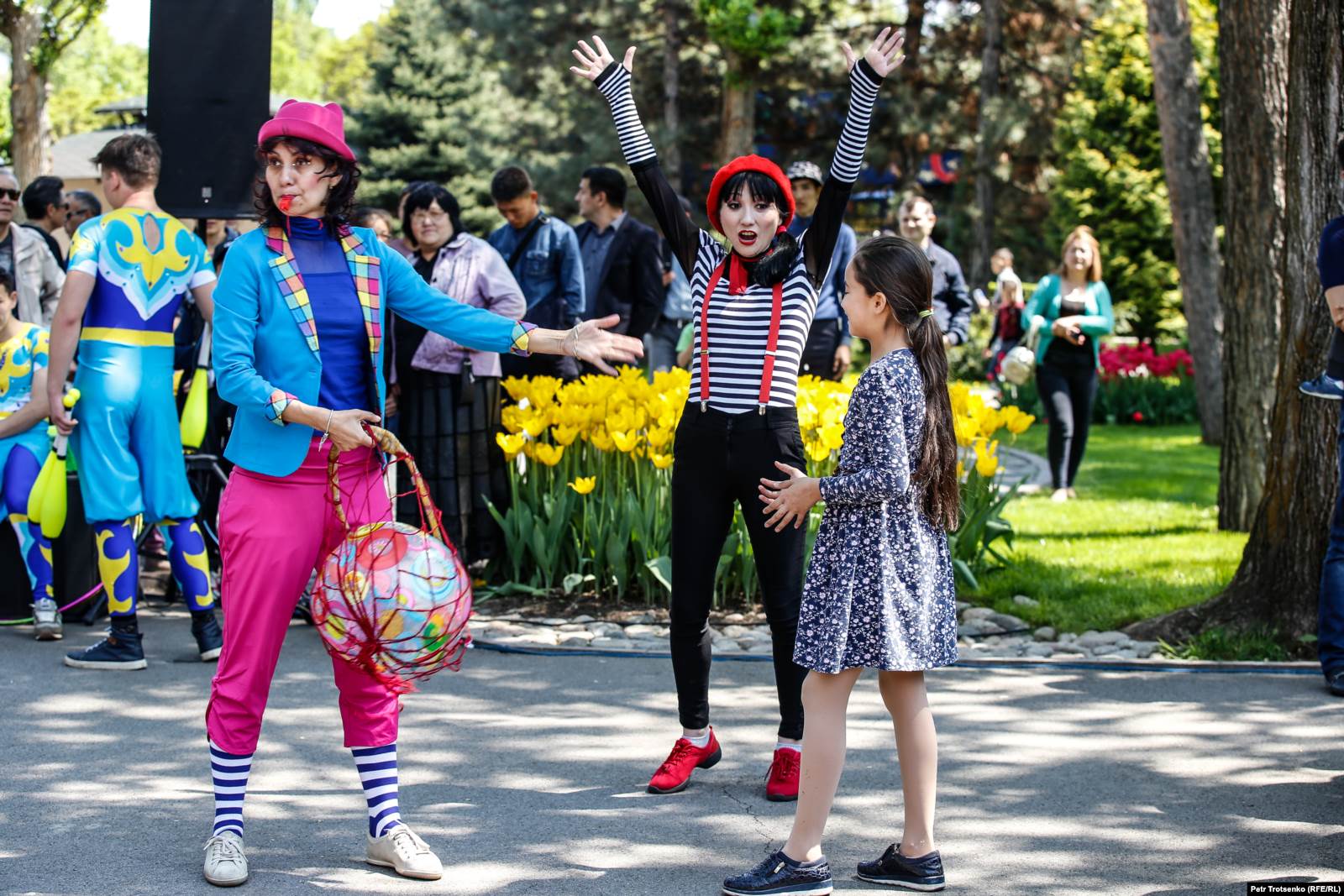 Одна из женщин протянула своей дочке охапку тюльпанов со словами: «Подари дядям». Та побежала раздавать цветы.