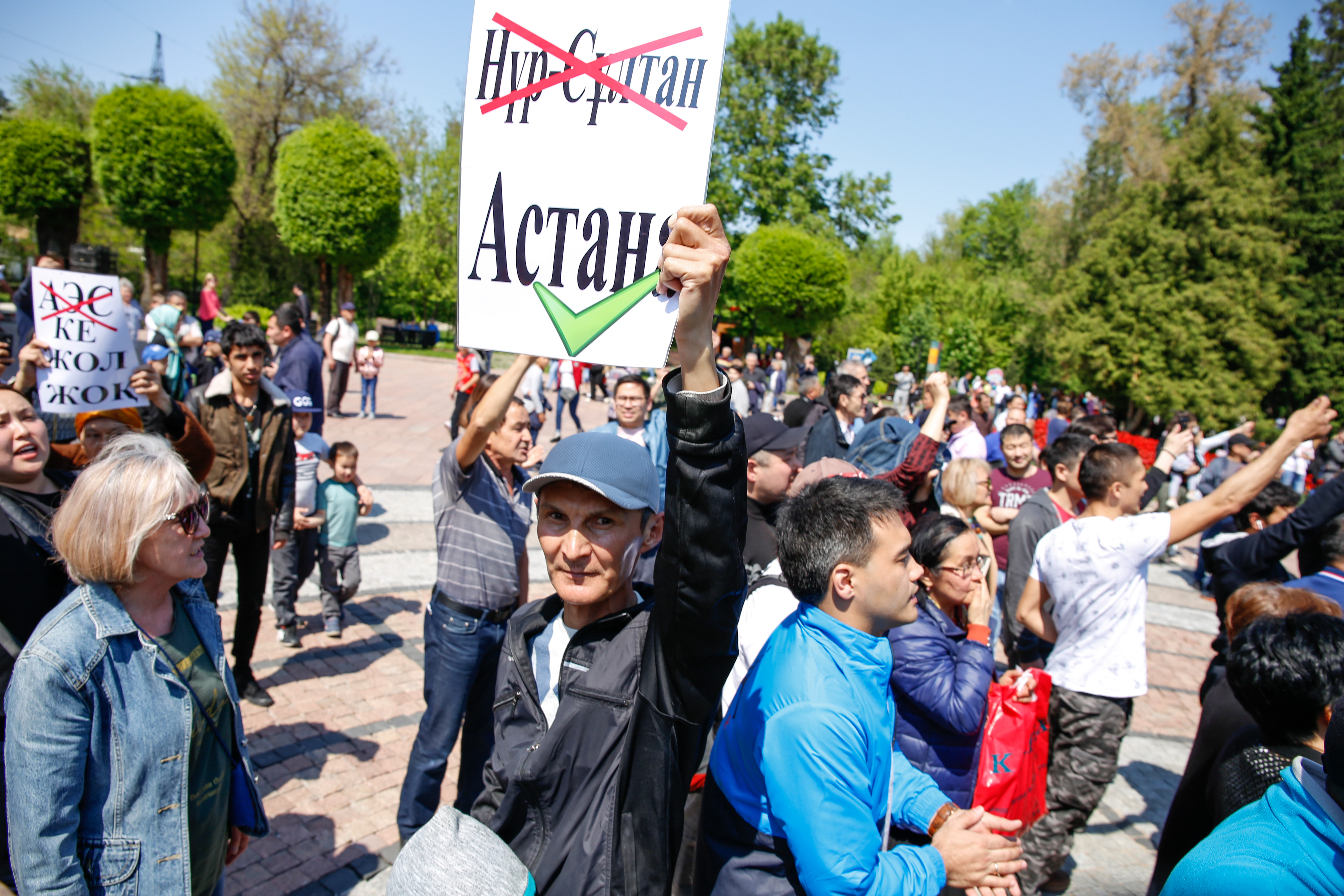 Митингующие, немного потолкавшись, продолжили выступать: против президента Касым-Жомарта Токаева, экс-президента Нурлсутана Назарбаева, переименования столицы из Астаны в Нур-Султан.
