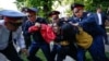 Бойцы спецназа вбегают в Центральный парк отдыха в Алматы, где проходит несанкционированный митинг, 1 мая 2019 года.