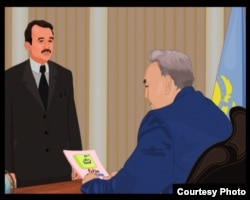 Премьер-министр Карим Масимов стоит перед президентом Нурсултаном Назарбаевым. Кадр из мультфильма «Сапа Олимпиадасы» («Олимпиада качества»), Снимки предоставила студия «Жебе» из Шымкента, где был снят мультфильм.