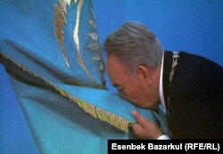 Президент Казахстана Нурсултан Назарбаев целует государственный флаг после принесения присяги народу. Астана, 8 апреля 2011 года.