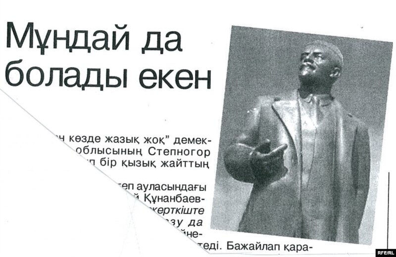 Последний пример подсказал мой редактор, большой любитель чтения казахских газет и журналов в рабочее время. Так вот, читатель популярной газеты «Жас Алаш» Толеш Торебайулы увидел в городе Степногорске Ленина, как бы слегка переделанного под ...Абая. Во дворе городской школы номер шесть стоит Ленин в тюбетейке, чур, Абай. Как поведал читатель в номере газеты за 3 сентября 2009 года, об этом конфузе горожане писали и возмущались властям города Степногорск не раз.