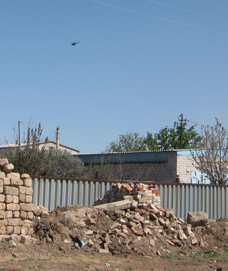 В небе над домом Махатовых в день похорон Рахимжана Махатова кружит вертолет. Актобе, 20 мая 2011 года.
