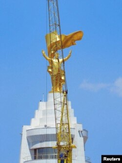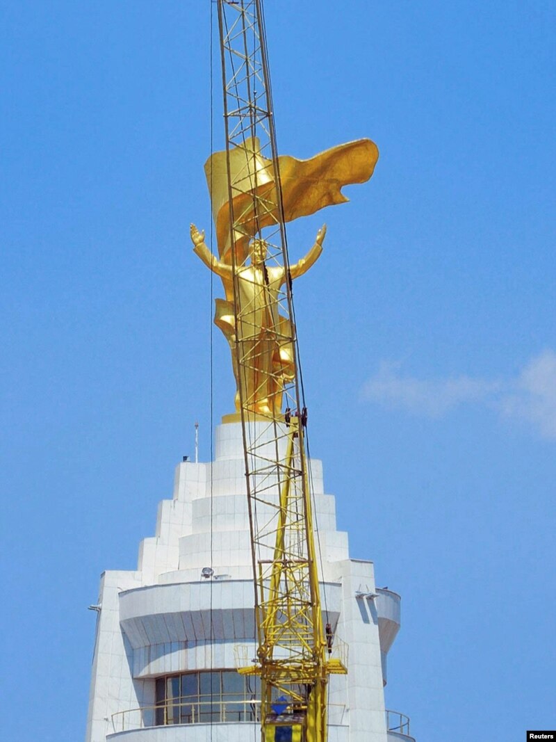 Демонтаж золотой статуи бывшего президента Туркменистана Сапармурата Ниязова. Ашгабат, 20 июля 2010 года.
