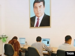 Фото бывшего президентаТуркменистана Сапармурата Ниязова на стене в интернет-кафе в Ашгабате.