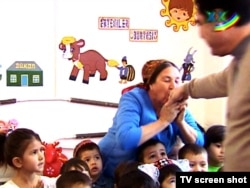 Президенту Туркменистана Гурбангулы Бердымухамедову целуют руку во время его посещения детского сада в Марыйском велаяте. 26 января 2011 года.