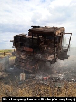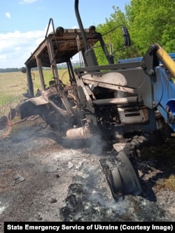 Зерноуборочный комбайн, уничтоженный после подрыва на противотанковой мине в Харьковской области. 30 июля. По данным украинских властей, комбайнера госпитализировали, он выжил после взрыва.