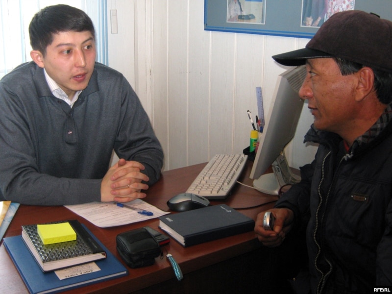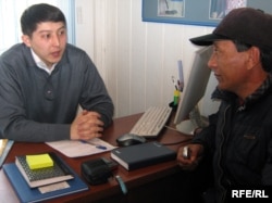 Менеджер проекта ПРООН/ДООН (Программа развития ООН/Программа добровольцев ООН) Думан Жампеисов беседует с оралманом Самарханом Токтарханом. Семей, май 2010 года.