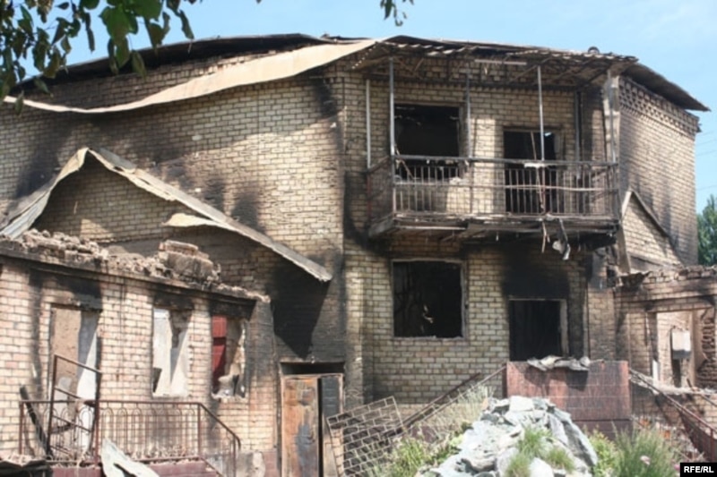 Сгоревший дом семьи бывшего президента Кыргызстана Курманбека Бакиева. Село Теит, Джалалабадская область, 15 мая 2010 года.