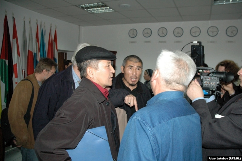 Председатель союза журналистов Сейтказы Матаев пытается успокоить активиста движения "Желтоксан-86" Талгата Рыскулбекова (в центре), который сорвал пресс-конференцию оппозиционеров в Национальном пресс-клубе. Алматы, 27 октября 2010 года.