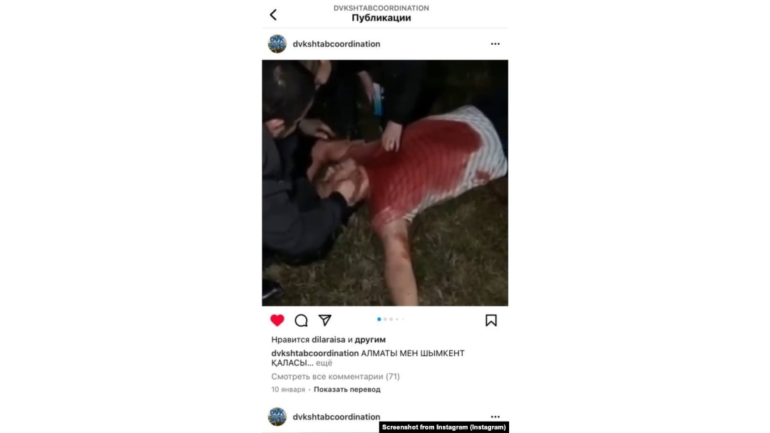 Позже родственники увидели в Instagram’е видео (опубликовано на странице dvkshtabcoordination. — Ред.) с истекающим кровью мужчиной, лежащим на улице Назарбаева, где находится городской акимат. Они узнали в нем Багдада. Люди на видео растерянно проверяют сердцебиение мужчины в окровавленной рубашке, отчетливо слышны выстрелы.